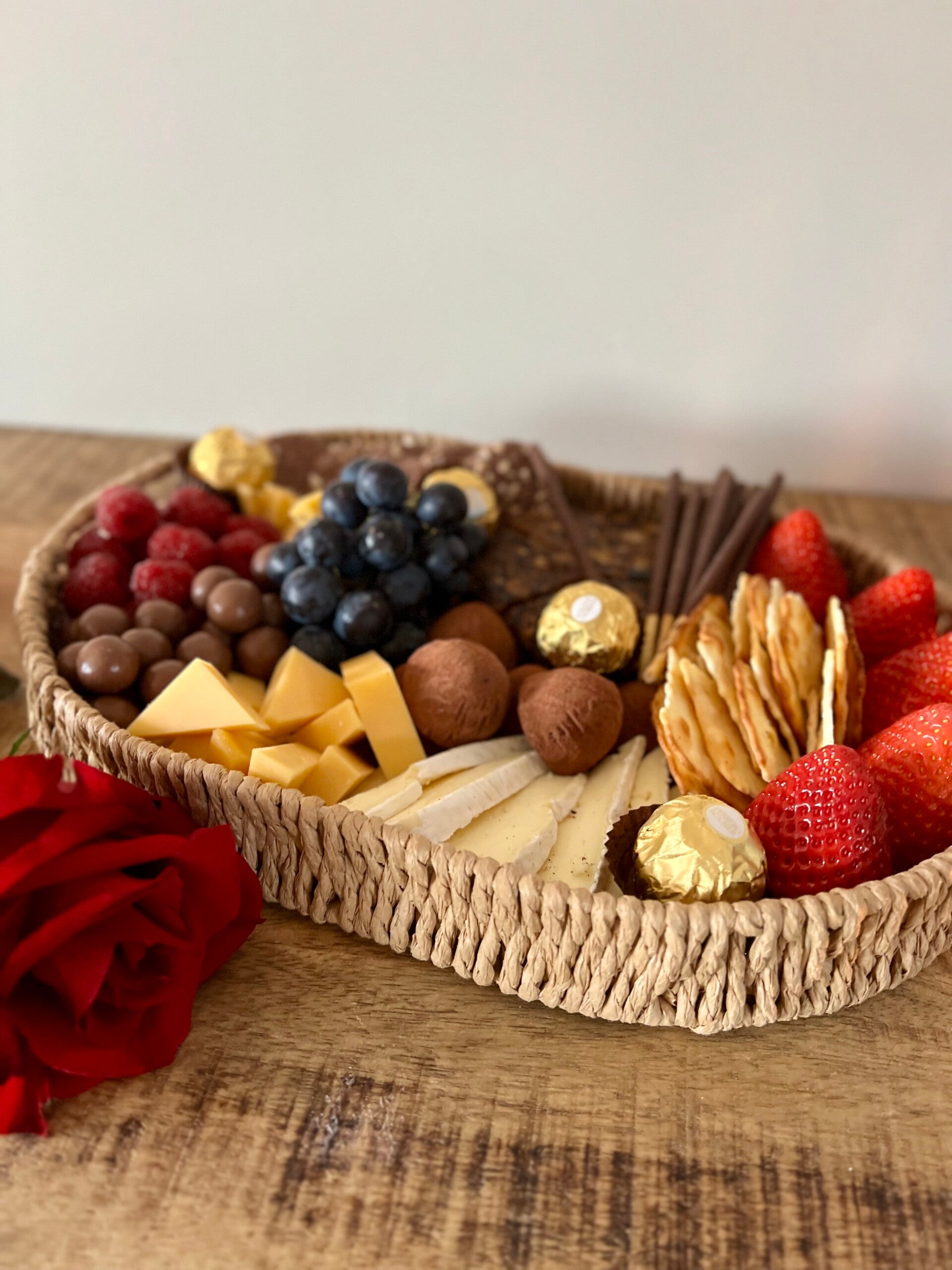 Geniet van de Valentijn borrelplank, gevuld met kazen, chocolade en lekkernijen waar jullie de hele avond samen van kunnen genieten.